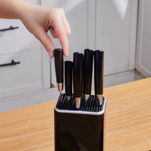 De 6-delige messenset van Karaca is een professionele messenset die zowel de keuken als u een meester maakt. De scherpe roestvrijstalen messen zorgen voor een gezond gebruik, zonder jarenlang hun scherpte te verliezen. Met deze messenset, die erg handig is dankzij de 5 messen, allemaal uitgerust met perfecte ergonomische handgrepen, en de stijlvolle standaard, kunt u gemakkelijk alles bereiden en heerlijke gerechten bereiden in een mum van tijd. kortst. Handen wassen wordt aanbevolen.